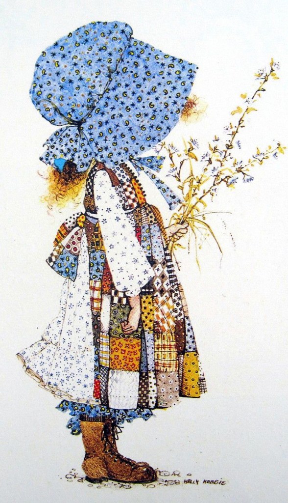 In 1967 Holly Hobbie’s famous “blue girl” was featured on a few cards for American Greetings. The response to those cards was so favorable that American Greetings wanted to do more with Holly Hobbie’s designs. An American Greetings artist and designer named Bob Childers had the vision of seeing the Holly Hobbie character in doll form. Childers hand sewed a prototype Holly Hobbie doll. Then Creative Vice President Tom Wilson–the creator of Ziggy–took the prototype to Knickerbocker Toys. By 1975 a line of Holly Hobbie rag dolls was on store shelves!